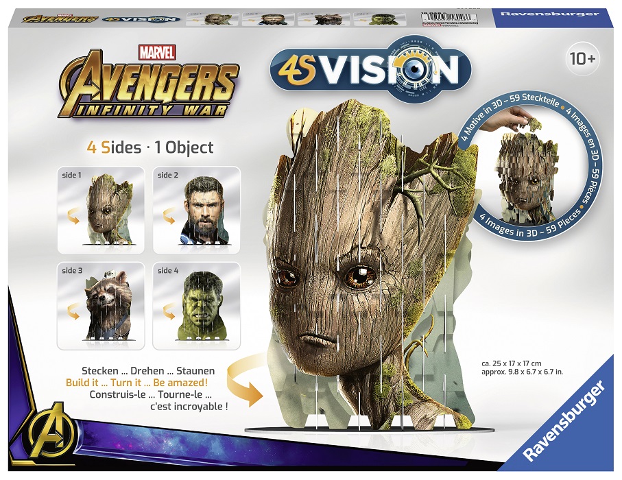 Von vorn ein Löwe, von rechts ein Leopard, von hinten ein Tiger und von links ein Panther: Das innovative 3D-Objekt „4S Vision“ von Ravensburger bringt bei wechselndem Blickwinkel vier verschiedene Ansichten einer Steckfigur zum Vorschein.