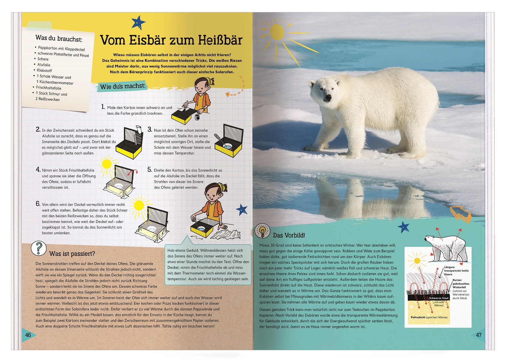 24 solcher Erfindungen werden anhand abwechslungsreicher Experimente mit leicht verständlichen Schritt-für-Schritt-Anleitung vorgestellt und können von den Kindern direkt ausprobiert werden. Jedes Experiment wird begleitet von tollen Illustrationen und Fotos, einer wissenschaftlichen Erklärung der verwendeten Technik sowie einem anschaulichen Infotext zum natürlichen Vorbild der jeweiligen Erfindung.
