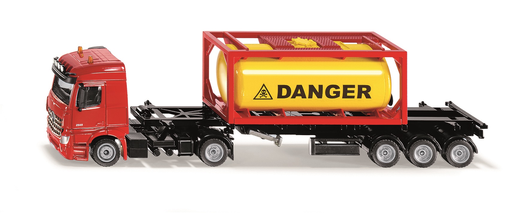 Auf dem Frachter, auf der Schiene oder eben auf der Straße. Dort übernimmt der neue SIKU SUPER50 Mercedes-Benz Arocs (Maßstab 1:50, UVP 28,99 Euro) mit einem dreiachsigen Sattelauflieger den Transport.