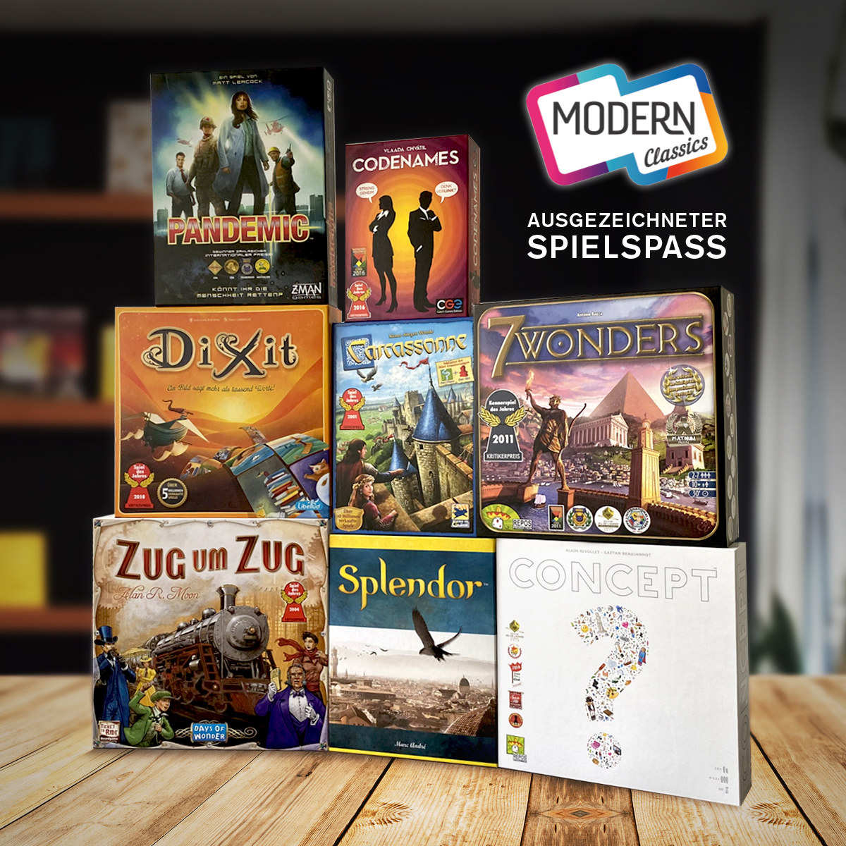 Die Modern Classics Dixit, Codenames, Zug um Zug, Concept, Pandemic, Splendor, Carcassonne und 7 Wonders sind alle weltweit preisgekrönte Spiele.