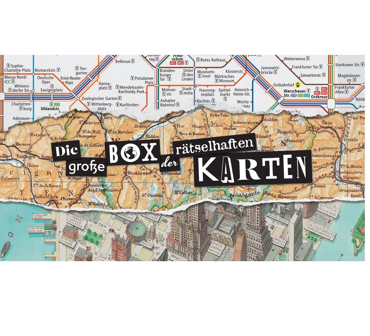 Rätseln Sie sich einmal um die Welt: „Die große Box der rätselhaften Karten“ bietet Rätsel- und Geographiefreund*innen stundenlangen Suchspaß. Auf 10 auseinanderfaltbaren Landkarten und (Stadt-)Plänen aller Art finden sich insgesamt 250 Aufgaben aus sieben Denksport-Kategorien, die zur ausführlichen Erkundung der Karten einladen.