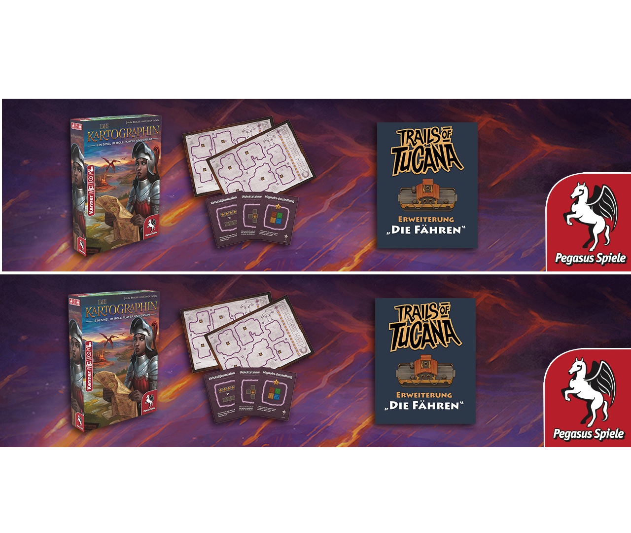 Mit dem eigenständigen Grundspiel Die Kartographin und der Erweiterung für Der Kartograph und Die Kartographin, Unbekannte Lande, können Spielende ab sofort wieder auf Expedition in den Landen von Königin Gimnax gehen. Darüber hinaus hat Pegasus Spiele mit Trails of Tucana: Die Fähren kürzlich auch eine Erweiterung für das familienfreundliche Flip & Write-Spiel Trails of Tucana veröffentlicht.