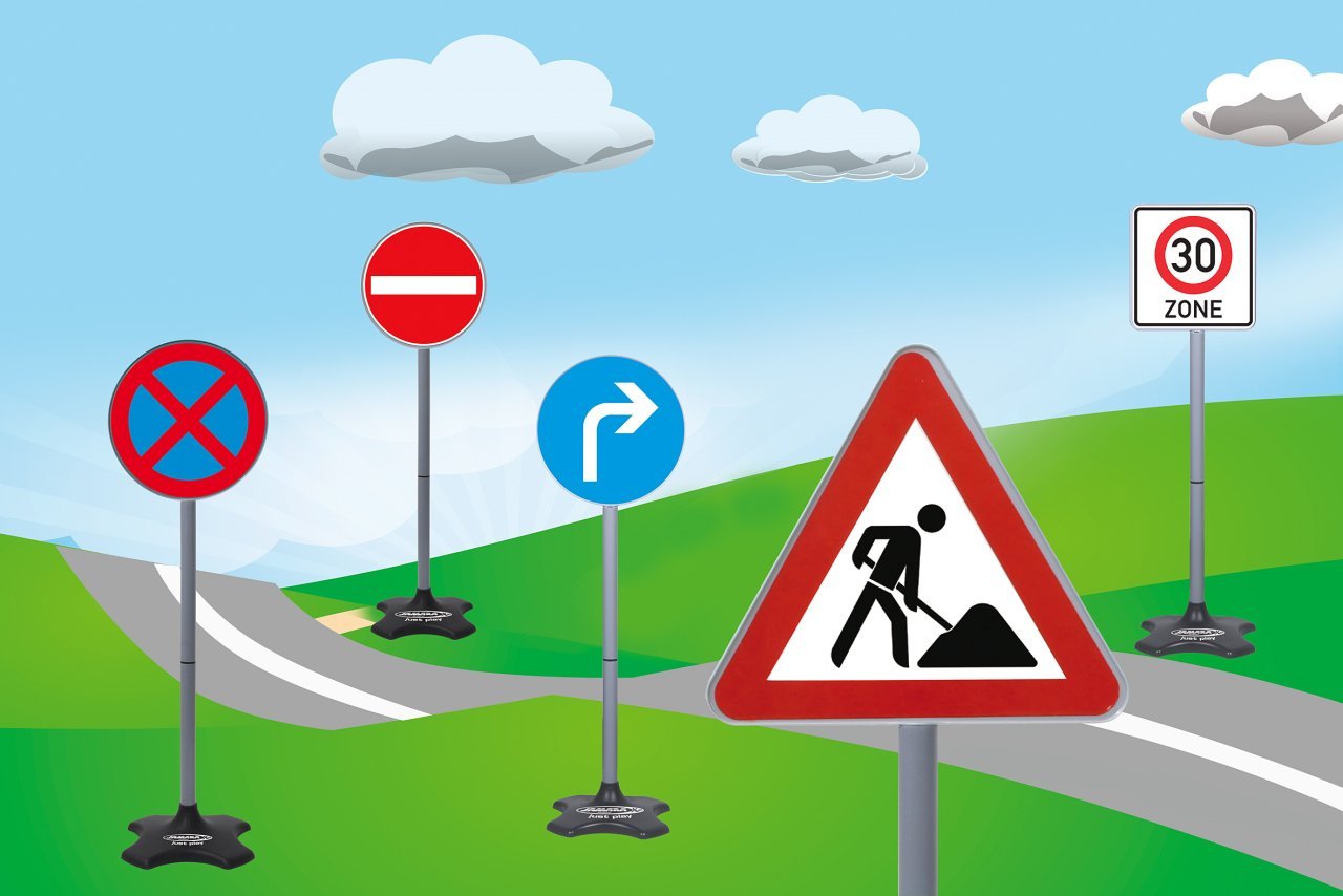 Jedes Verkehrsschild besteht aus 4 Elementen, die sich kinderleicht zusammenstecken lassen. Ergänzend zu den Verkehrsschildern bietet Jamara die passende Ampel.