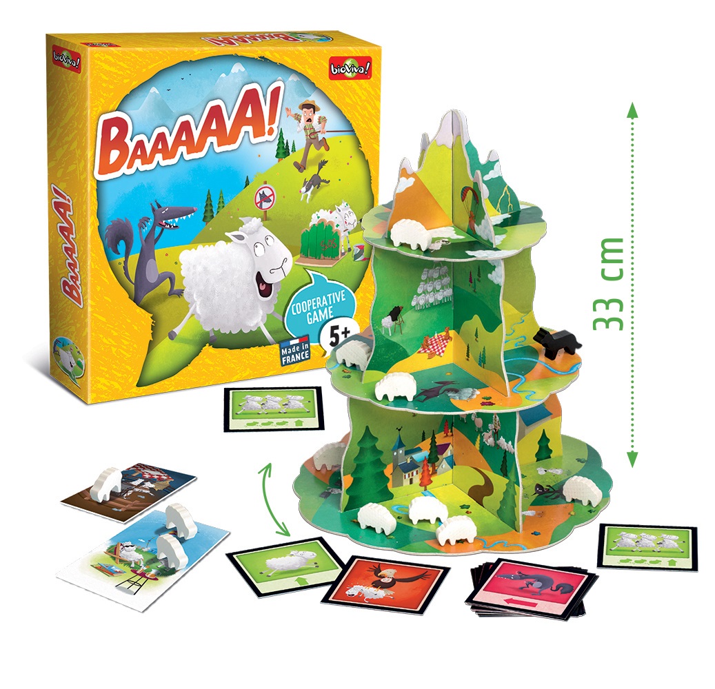 Zauberhaft gestaltet ist das dreidimensionale Spiel Baaaaa! Ein hübscher Berg in den Alpen mit Bachläufen, saftigen Wiesen und einem schneebedeckten Gipfel verteilen sich auf drei Ebenen.