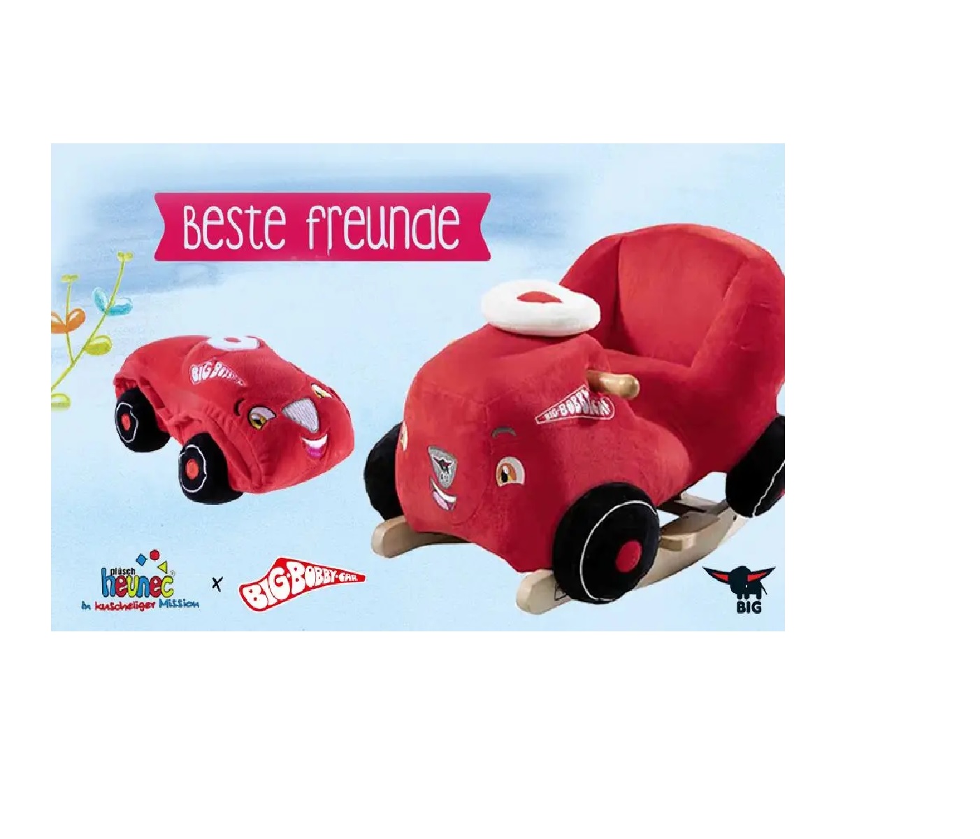 Platz da! Jetzt kommen wir! Ab sofort gibt es das bekannteste Kinderauto erstmalig auch als super-softe und süße Plüsch-Variante im Handel. Ob als kuscheliges Autokissen mit integrierter Hupe oder als große BIG Bobby Car Sitzschaukel: die Kids werden beide lieben!