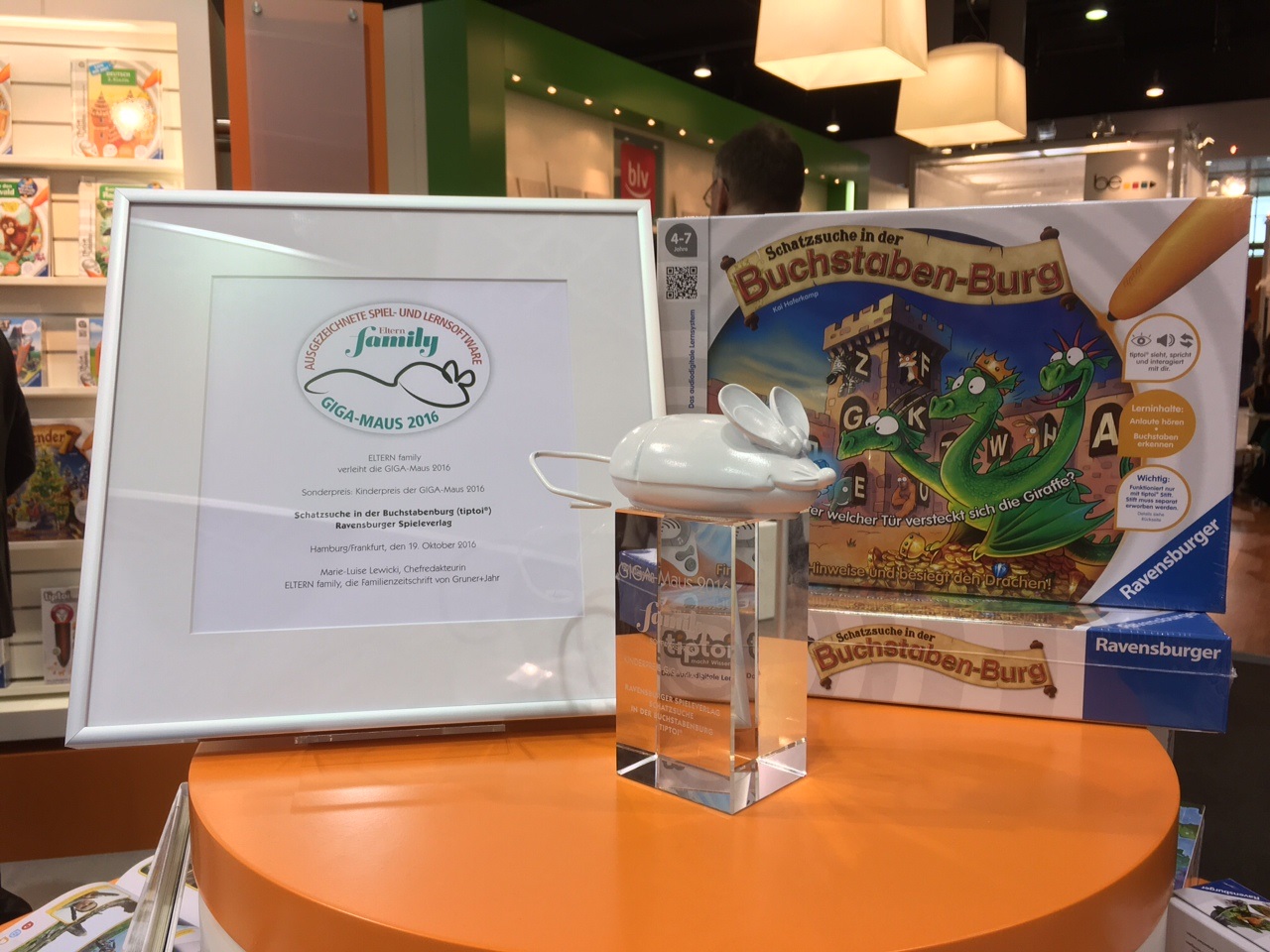 Das Ravensburger Leselernspiel „tiptoi® Schatzsuche in der Buchstabenburg“ hat heute auf der Frankfurter Buchmesse den Kinderpreis der GIGA-Maus 2016 gewonnen.