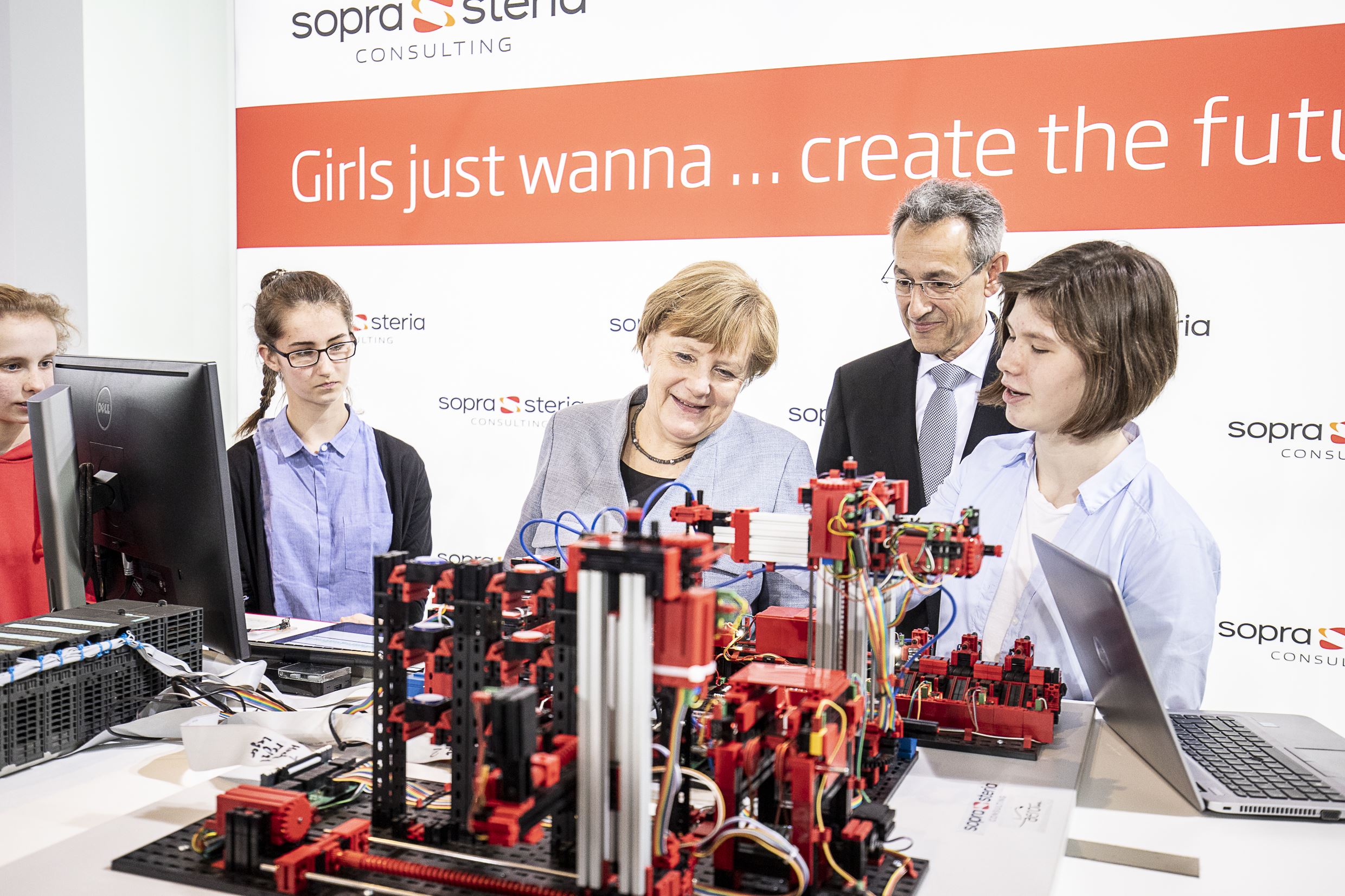 Für die „Fabrik der Zukunft“ entwickelten Schülerinnen ein Modul, das Daten auslesen und in eine Cloud weitergeben kann. Darüber hinaus programmierten sie einen Sprachassistenten zur Datenabfrage und Steuerung. Die promovierte Physikerin Angela Merkel zeigte sich begeistert von der Fabrikanlage der Zukunft, durch die Industrie 4.0 auf einfache Weise dargestellt wird.