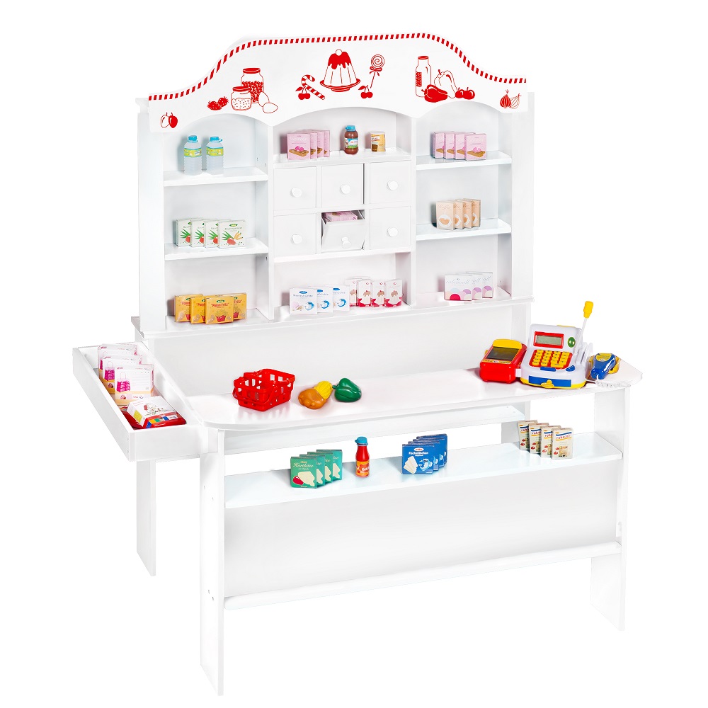 Für das mitgelieferte Kaufladenzubehör ist durch die praktische Front- sowie Seitentheke (Höhe: 58cm – Seitentheke geringfügig niedriger) genug Ablagefläche vorhanden. Die 6 Schubladen und Regalfächer bieten zusätzlichen Platz für die kleinen Kaufladen-Waren.