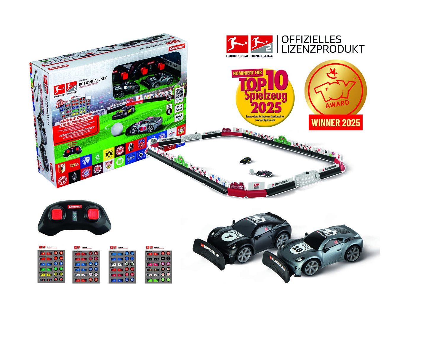 Nun wurde das Carrera RC Fußball Set – Modell Bundesliga als eines der „TOP 10 Spielzeuge 2025“ nominiert. Die gemeinsame Marketingaktion von Spielwaren-Fachhandel und Markenherstellern ist seit über 20 Jahren ein verlässliches Trendbarometer der Branche und hebt besonders kreative, verkaufsstarke Produkte, mit Spaßpotential für jedes Alter hervor.