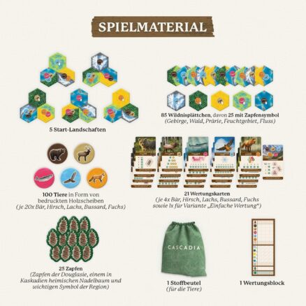 Die Bären fressen am Wasser Lachse. Kurzum, ein kleines Paradies. Das Spielmaterial, von dem es hier reichlich gibt, wird entsprechend der Spielanleitung verteilt. Wobei die Anzahl der Landschaftsplättchen von der Anzahl der Spieler abhängt.