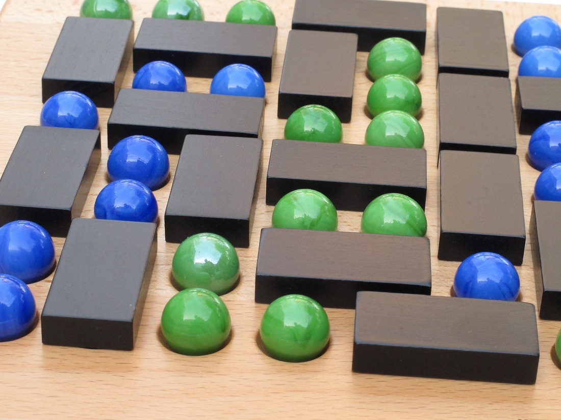 Neu ist, dass das Spielmaterial komplett aus Holz besteht und Glaskugeln gewissermaßen als Spielfiguren dienen. Ein Spieler spielt dabei mit blauen und der andere mit grünen Kugeln. Die Spieler legen abwechselnd die Klötzchen, einer waagerecht der andere senkrecht so auf dem Spielfeld ab, dass man dabei Felder umzingelt.