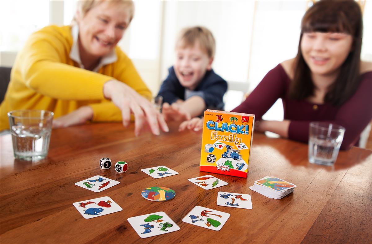 Der Spieler mit den meisten Karten gewinnt. Während bei Clack! Family gleich mehrere Dinge gleichzeitig erfasst werden müssen und so die ganze Familie herausfordert, ist das erfolgreiche Kinderspiel Clack! von Halli GalliErfinder Haim Shafir bereits von Kindern ab 4 Jahren spielbar. Statt Karten müssen hier Magnetscheiben je nach gewürfelter Farbe und Symbol schnell aufeinander „geklackt“ werden.