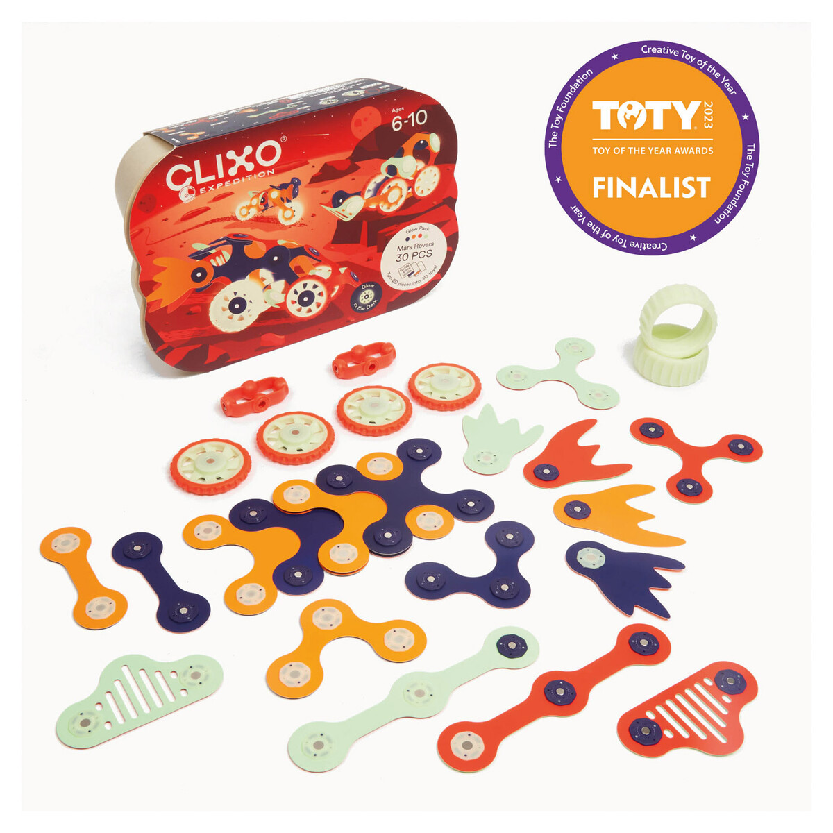 Die flexiblen Formen lassen sich einfach und hörbar zusammenklicken und in alle Richtungen drehen – perfekt für die unendliche Kreativität und zur Förderung der Vorstellungskraft von Kindern ab 3 Jahren. Die einzelnen Teile sind aus recyceltem Papier und stabil und die Magnete sind integriert, sodass die Sicherheit garantiert ist. Clixo wurde mit zahlreichen Preisen ausgezeichnet, unter anderem mit dem Top Toys of the Year Award 2022.