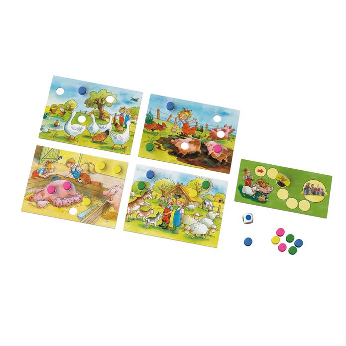 Und wenn man einen Stern gewürfelt hat, ist dies eine Art Joker, und man kann sich einen passenden Stein aussuchen. Hat man die Conni gewürfelt, wird diese ein Feld weiter gezogen, so dass sie dem Traktor immer näher kommt.
