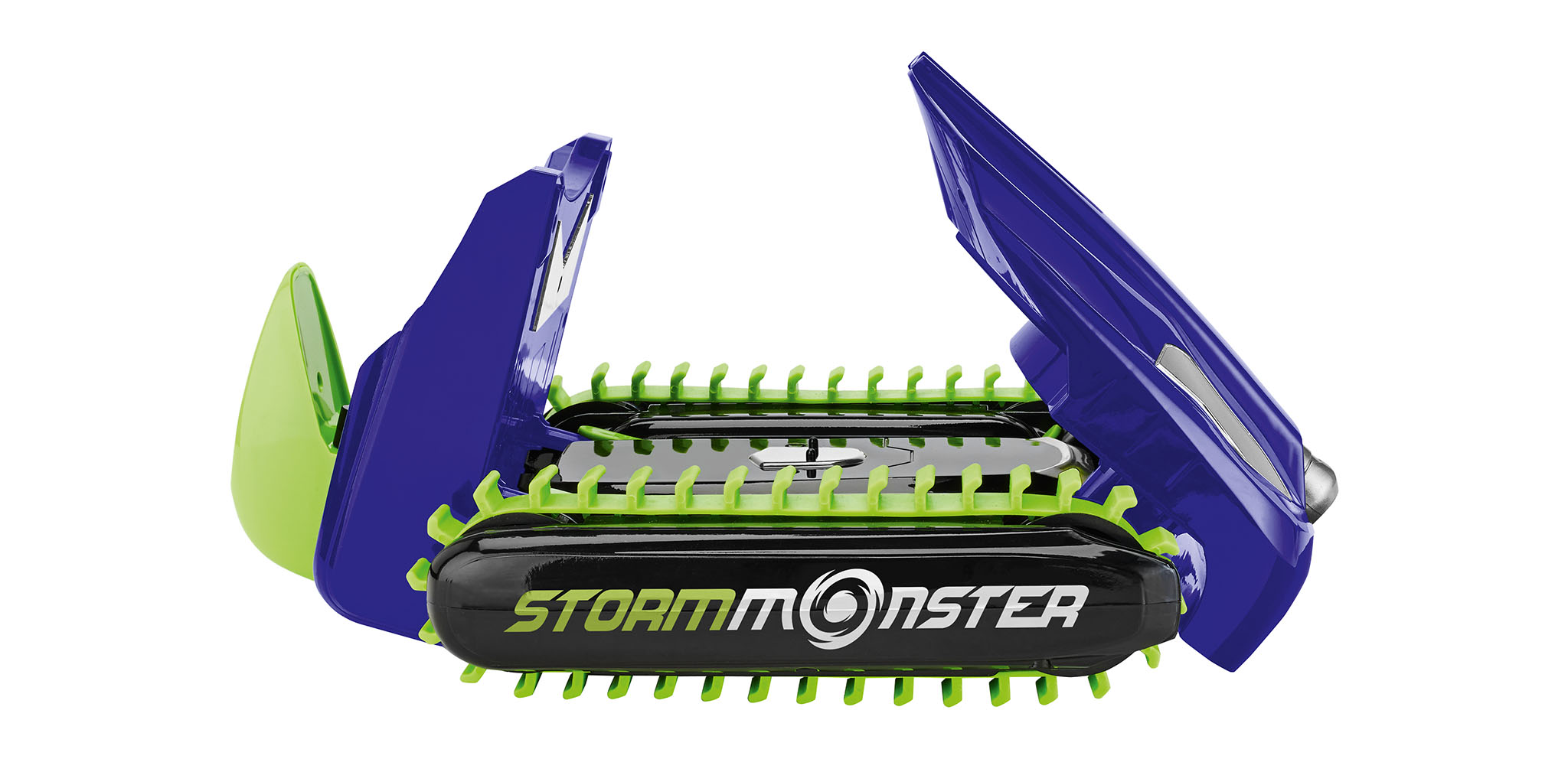 Das Storm Monster erkundet jedes Terrain: Er flitzt mit Kettenantrieb über Stock und Stein, pflügt sich durch Schnee und Sand oder verwandelt sich auf Knopfdruck in ein Wasserfahrzeug.