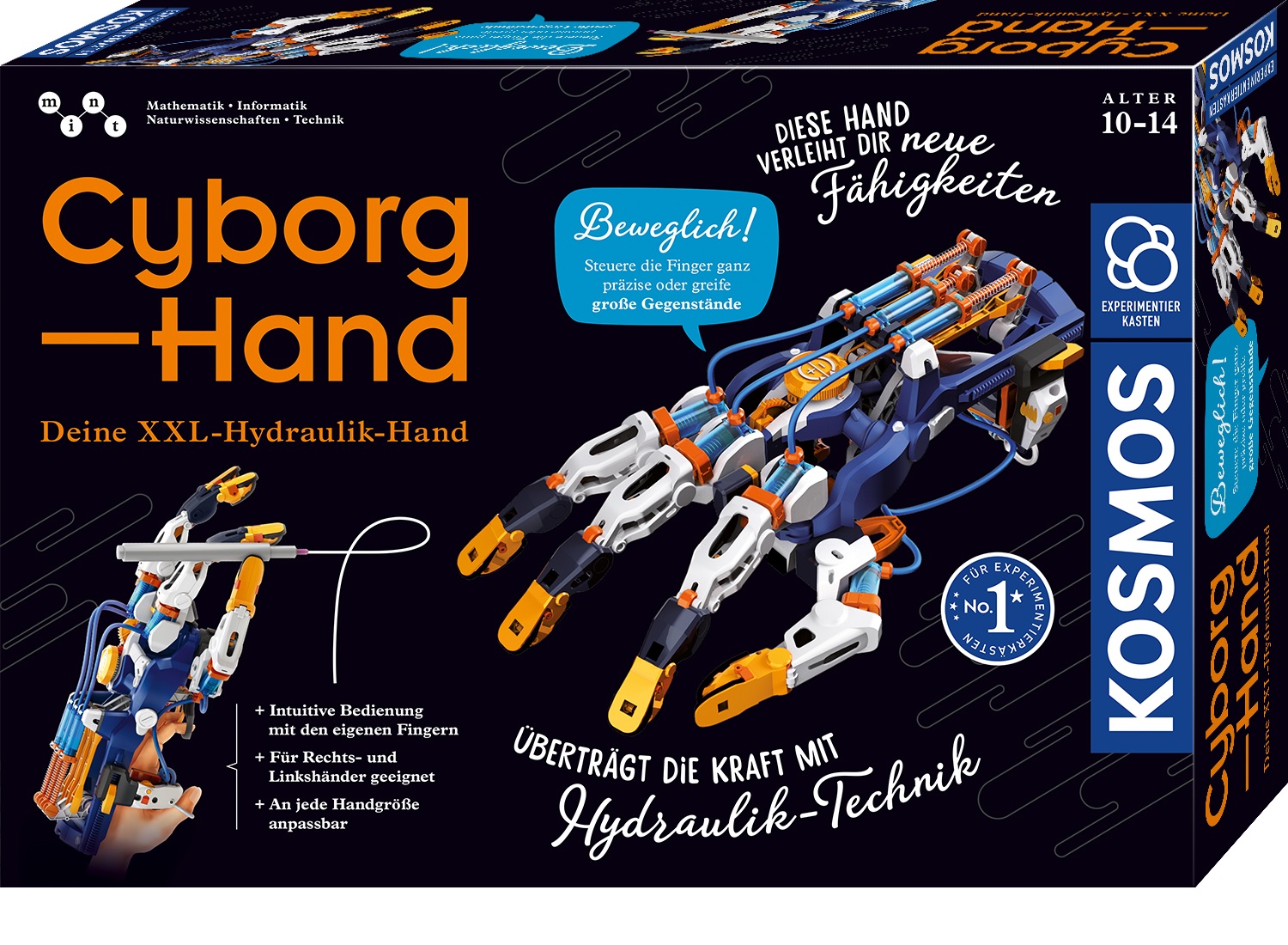 Mit dem KOSMOS Experimentierkasten „Cyborg Hand“ bauen Kinder ab 10 Jahren ein eigenes mechanisches Exo-Skelett zusammen. Ist die Roboterhand fertig, wird sie über der eigenen Hand getragen. Die Bewegungen des Trägers werden hierbei hydraulisch, also nur über den Druck von Wasser, übertragen.