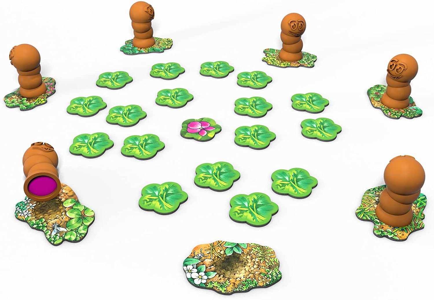 Schnell ist das Spiel vorbereitet. Die Blumen werden verdeckt rund um die Regenwurmlöcher verteilt, auf welchen die Regenwürmer platziert sind. Ein Feld davon ist frei. Unter den Würmern befindet sich eine Farbplatte und diese Farbe muss mit der Farbe der Blume übereinstimmen.