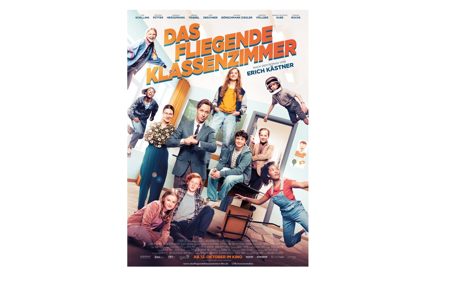 Endlich wieder auf der großen Leinwand! 90 Jahre nach seinem Erscheinen erhält DAS FLIEGENDE KLASSENZIMMER einen modernen Anstrich! Die gutgelaunte und mitreißende Neuverfilmung von Erich Kästners zeitlosem Kinder- und Jugendbuch kommt am 12. Oktober in die Kinos. Regisseurin Carolina Hellsgård („Sunburned“, „Wanja“) inszeniert das turbulente Internatsabenteuer nach einem Drehbuch von Gerrit Hermans („Tabaluga“, „Hilfe, ich habe meine Lehrerin geschrumpft“). In den Hauptrollen spielen Tom Schilling („Fabian oder Der Gang vor die Hunde“, „TKKG“), Trystan Pütter („JGA: Jasmin, Gina, Anna“, „Ku’damm 63“), Hannah Herzsprung („Der Boandlkramer“, „Babylon Berlin“) und Jördis Triebel („Irgendwann werden wir uns alles erzählen“, „Babylon Berlin“) sowie die Nachwuchsstars Leni Deschner, Lovena Börschmann Ziegler, Morten Völlger, Franka Roche, Wanja Valentin Kube, Holly Schiek, Aaron Sansi, Leander Schumann, u.v.m.
