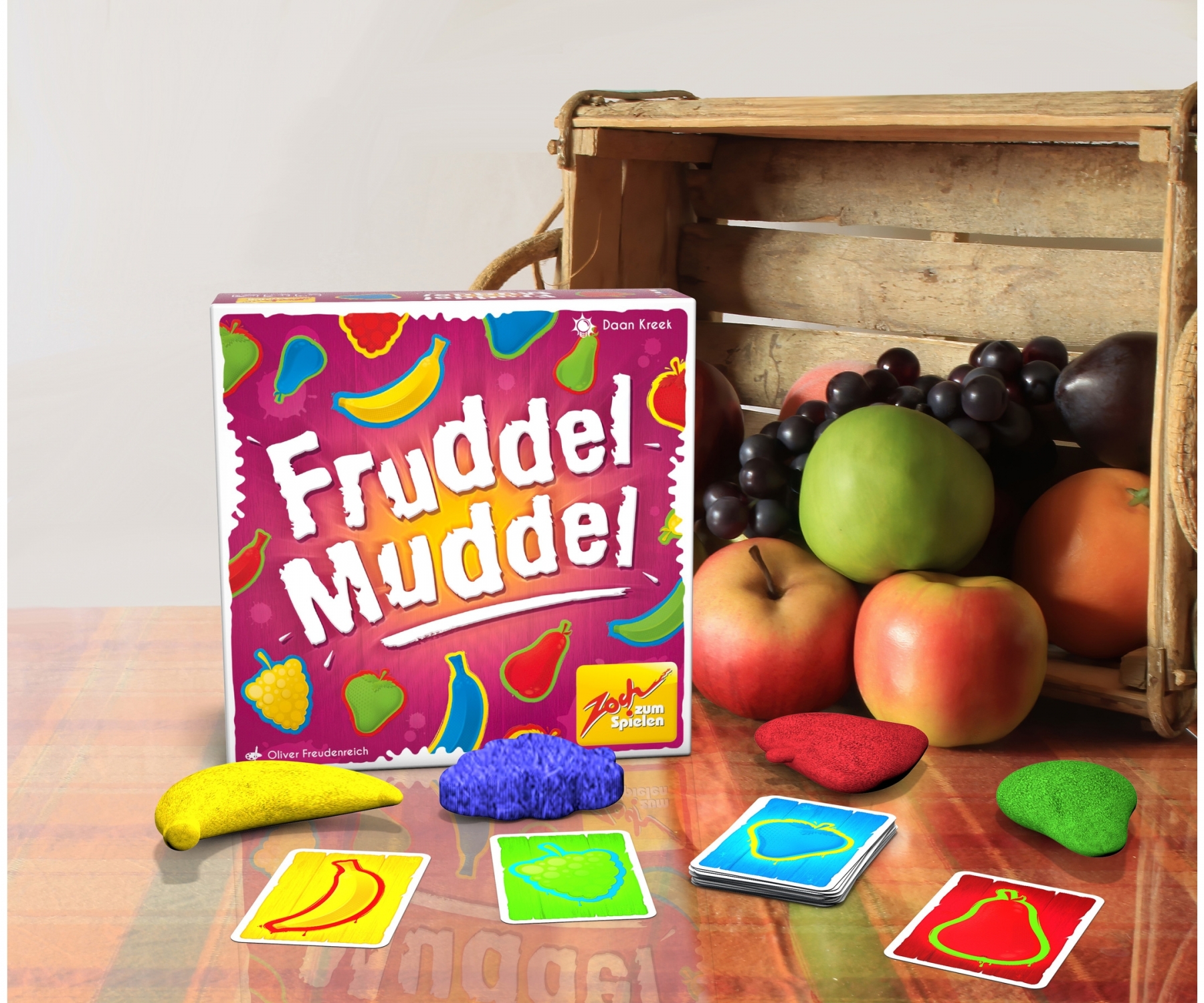 „Fruddel Muddel“ ist das Kuddelmuddel mit Früchten und Farben, das Schwung in jeden Familien-Spieleabend bringt. Mit seinen kurzweiligen 15 Minuten und sehr einfachen Spielregeln ist es auch ideal als Partyspiel geeignet.
