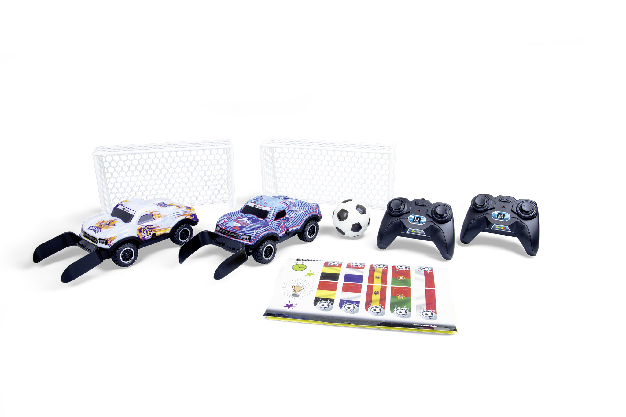 An beiden RC Cars sind Führungsschaufeln angebracht, mit denen das Runde ins Eckige befördert wird. Durch ihre praktische Größe von 17 cm Länge im Maßstab 1:22 kann man sie überallhin mitnehmen und so eignen sie sich perfekt, um jeden beliebigen Quadratmeter in ein Fußballfeld zu verwandeln.