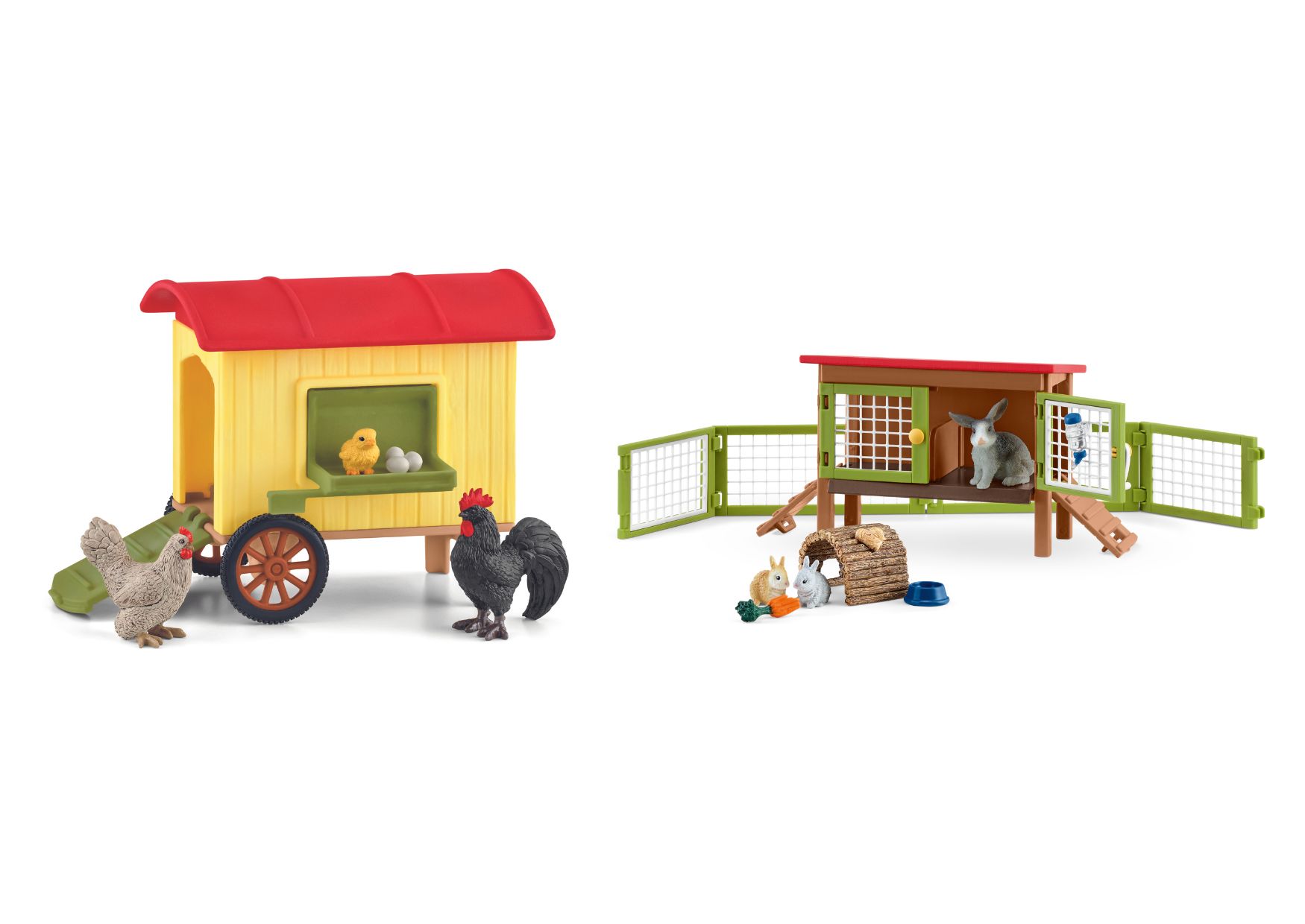 Der Kaninchenstall ist hinterm Vorhang versteckt und hat mit Napf, Trinkflasche, Außengehege und Spieltunnel alles, was das Kaninchenherz begehrt. Direkt daneben ist der mobile Hühnerstall aufgebaut, der dank seiner Räder an verschiedene Orte gezogen werden kann. Ob Huhn und Kaninchen wohl wieder in ihr richtiges Zuhause zurückkehren?