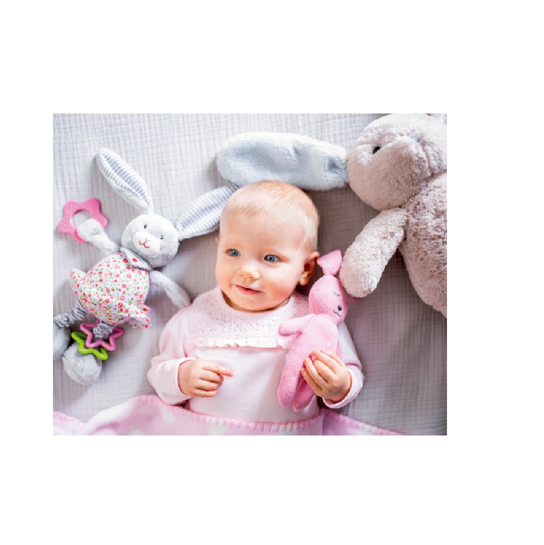 Plüschtiere, Schnuffeltücher und Minirasseln laden zum Kuscheln und Spielen ein. Spieluhren entführen in das Land der Träume und das Steh-auf-Glockenspiel haut so leicht nichts um.
