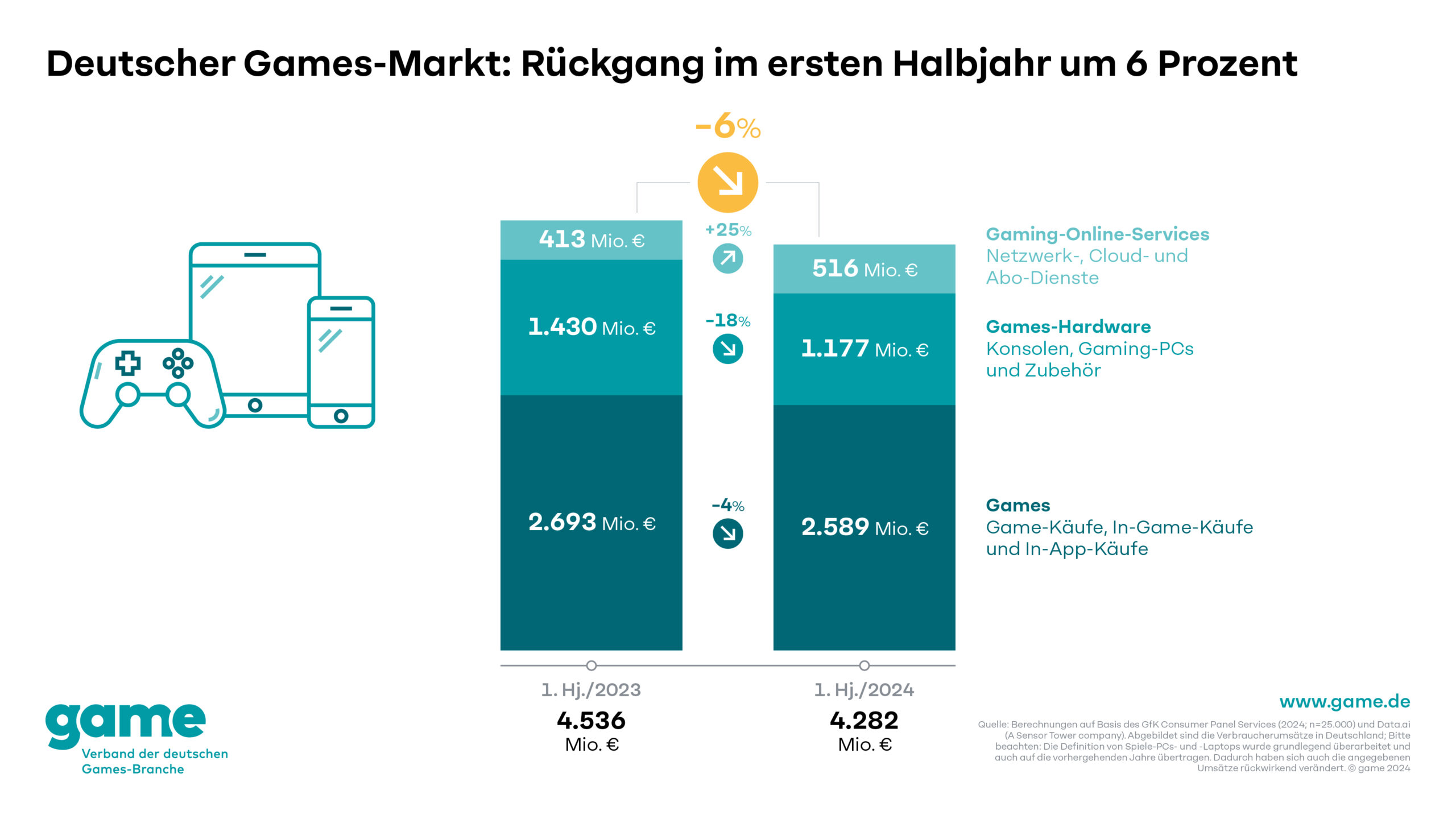 Nach dem starken Wachstum des deutschen Games-Marktes in den vergangenen Jahren, ist er im ersten Halbjahr 2024 erstmals seit langer Zeit ins Minus gerutscht: Mit Games, Games-Hardware und Gaming-Online-Services wurden von Januar bis einschließlich Juni in Deutschland rund 4,3 Milliarden Euro umgesetzt – ein Minus von 6 Prozent im Vergleich zum Vorjahreszeitraum.