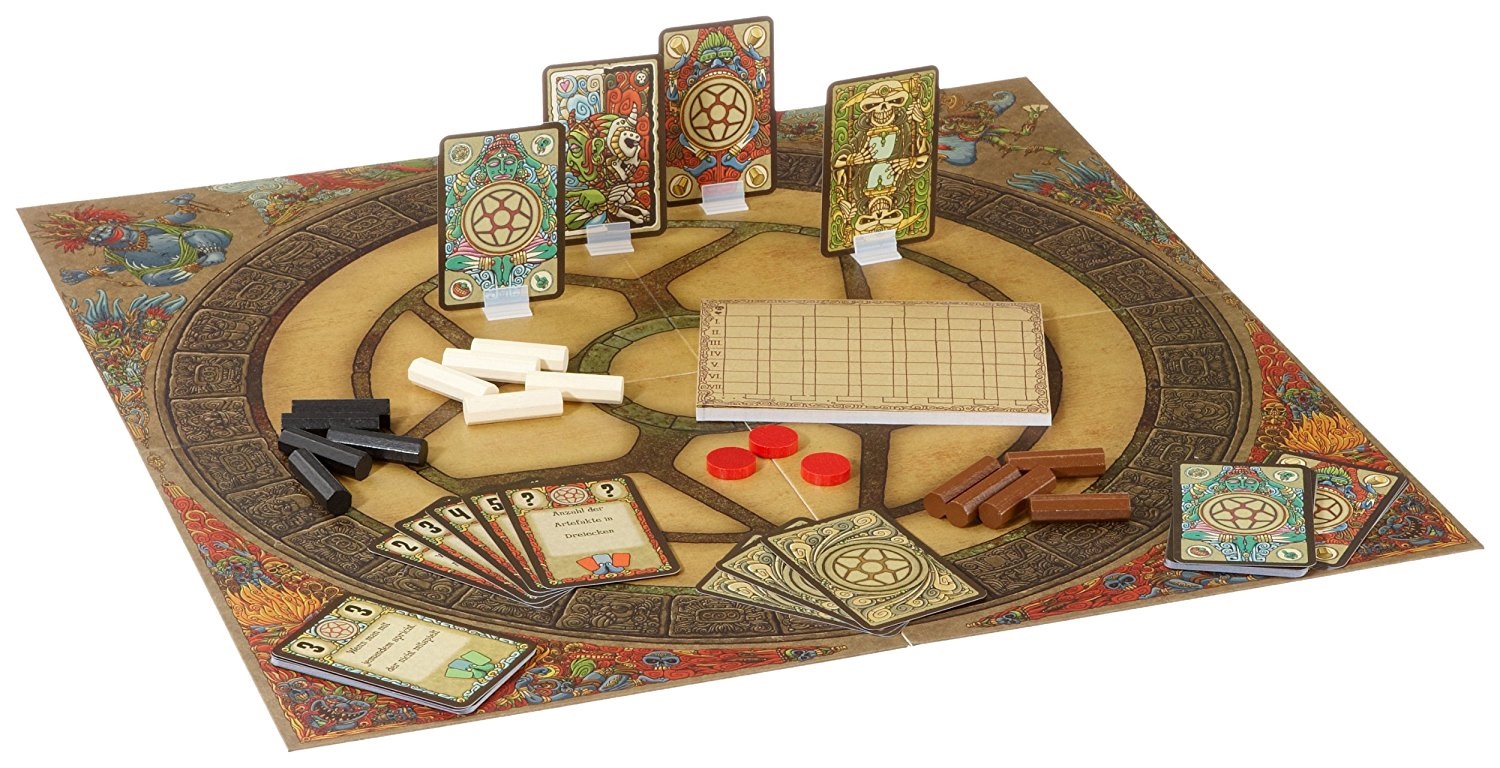 Der Spielplan zeigt den sogenannten Heiligen Kreis, in dem die entsprechenden Rituale stattfinden. So ist dieser dem Thema angepasst und sieht etwas düster aus. Das Spielfeld als solches wurde in 12 Gebiete aufgeteilt.