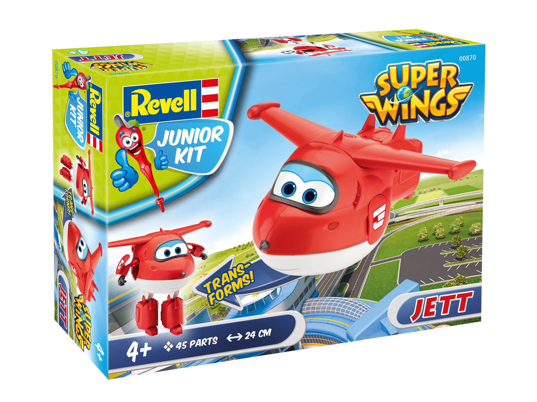 Dabei erleben er und seine Freunde unzählige Abenteuer und Herausforderungen. Der Clou der Super Wings ist ihre Eigenschaft, sich von Flugzeugen zu coolen Robotern transformieren zu können. Revell bietet erstmals zwei Junior Kit Produkte mit der Super-Wings-Lizenz, die sich mit dem cleveren Schraubsystem spielend leicht von Kindern ab vier Jahren zusammenbauen lassen. Einmal zusammengebaut, können sich die Flugzeuge blitzschnell und ohne weiteres Schrauben auch in Roboter verwandeln.