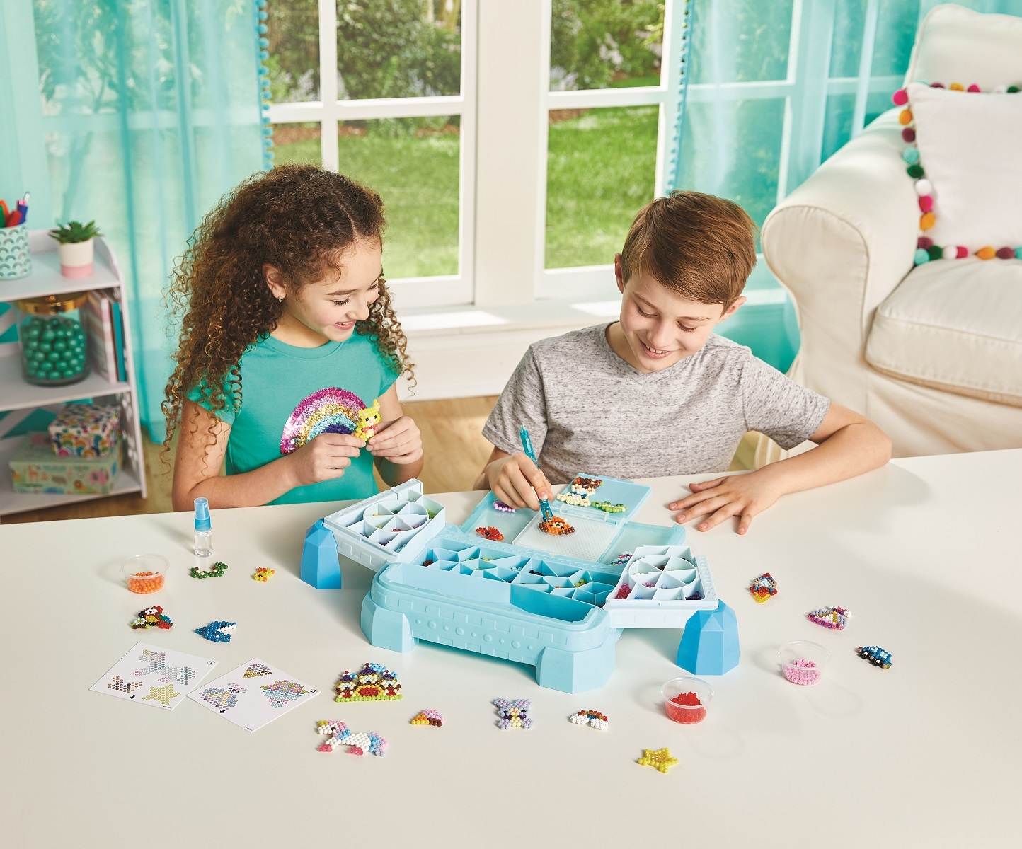 Zusätzlich enthält das Bastelset über 1.500 bunte Bastelperlen, einen Sprüher, einen Perlenstift und jede Menge coole Motivvorlagen.