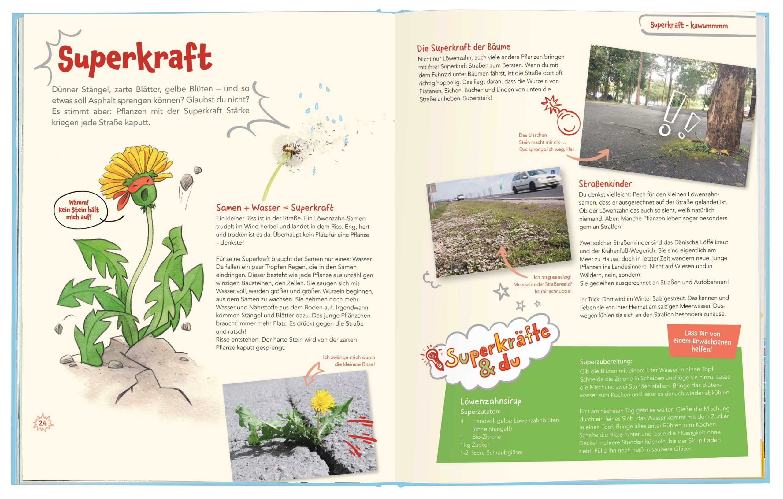 Im Buch „Die Superkräfte der Pflanzen“ werden 20 Superkräfte von unterschiedlichen Bäumen, Wurzeln, Blättern und Co. aus aller Welt vorgestellt. Neben spannenden Fakten rund um die verrücktesten Pflanzenhelden, die von lebhaften Illustrationen und tollen Fotos begleitet werden, stecken im Buch auch zahlreiche Mitmachaufgaben, Experimente und Rezepte.