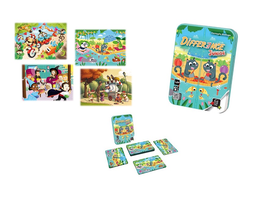 Difference Junior ist eine eigenständige Difference-Variante für Kinder. Wie gewohnt müssen Spieler Unterschiede auf verschiedenen Plättchen suchen.