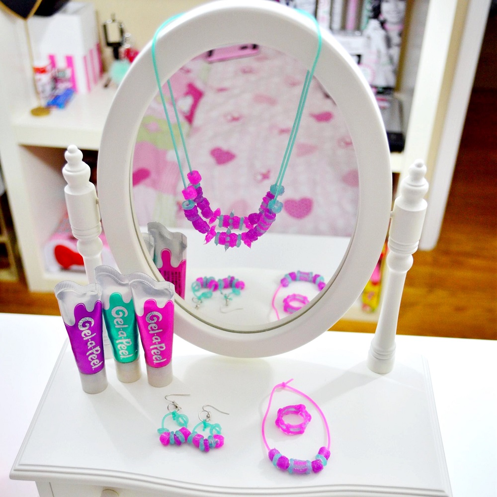 Dank der Gel-a-Peel Funkelperlenstation steht der Design-Karriere nichts mehr im Weg. Mädchen können mithilfe der Gel-Tuben Perlenarmbänder, -halsketten oder –ohrringe selbst gestalten.