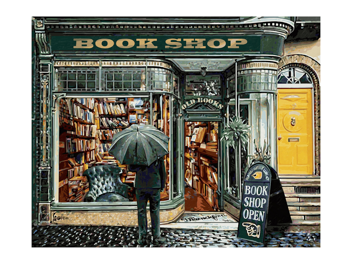 Jetzt gibt es die Möglichkeit, sich dieses einzigartige Ambiente nach Hause zu holen, mit dem neuen Motiv „Englischer Buchladen“ aus der Serie „Meisterklasse Premium“ von Schipper Malen-nach-Zahlen.