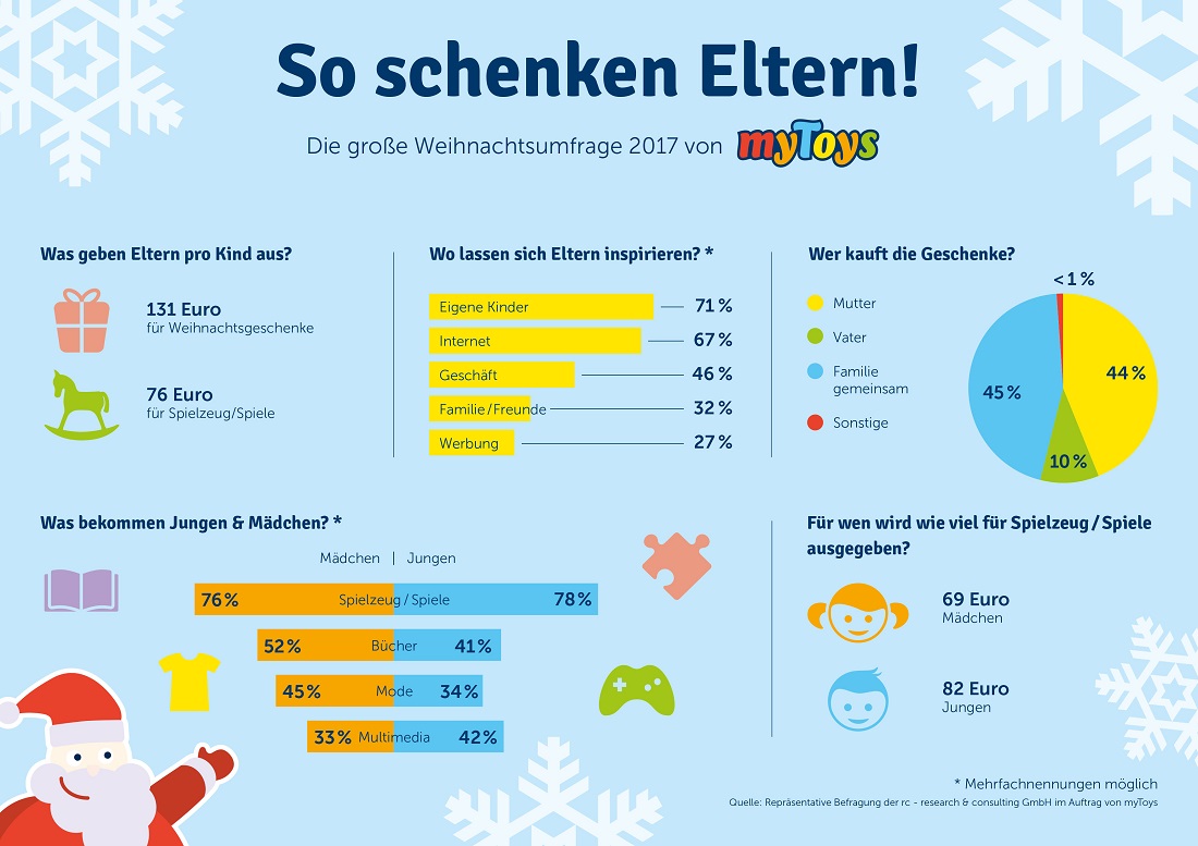 Im Rahmen der repräsentativen myToys-Umfrage zum Weihnachtsshopping von Familien wurden 1.053 Eltern mit Kindern im Alter zwischen 0 und 15 Jahren befragt.