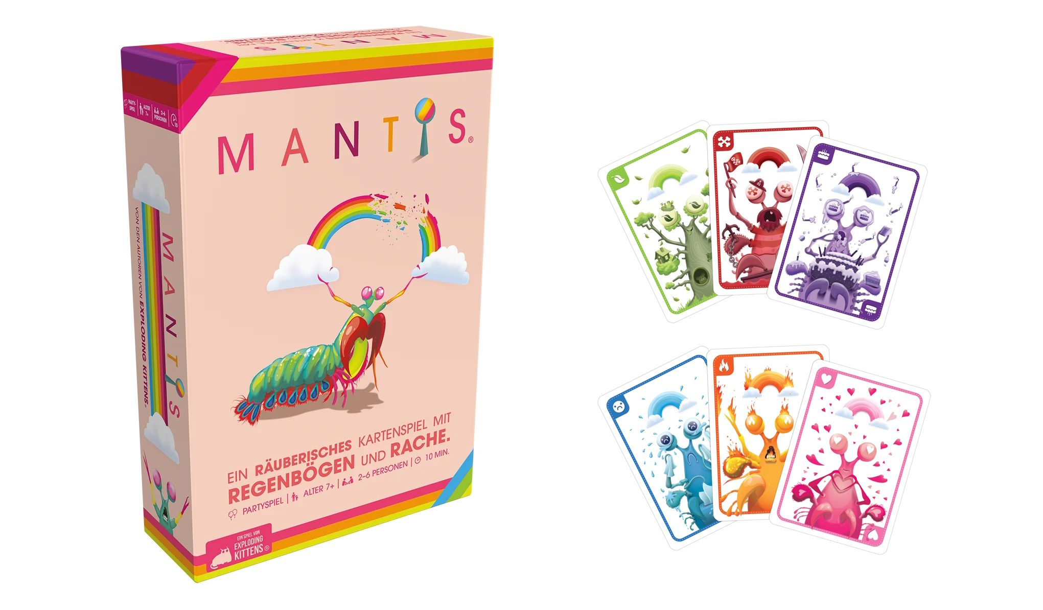 Mantis ist ein räuberisches Kartenspiel mit Regenbögen und Rache – und Fangschreckenkrebsen! Alle Spieler versuchen möglichst viele gleichfarbige Mantis-Karten in ihrem Aquarium zu sammeln. Dabei gibt es nur zwei einfache Regeln: Klauen oder Punkten.