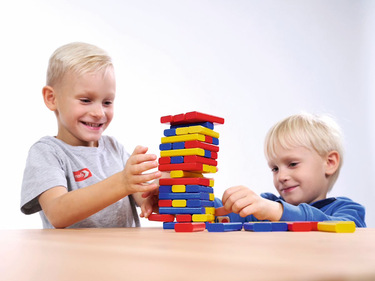 Bei „3 bunte Bausteinspiele“ kommt es besonders auf Farbverständnis, Aufmerksamkeit und Feinmotorik an. Drei tolle Spielvarianten sorgen für ausreichend Abwechslung: Beim „Bunten Wackelturm“ zeigt ein Farbwürfel an, welcher Baustein aus dem Turm genommen werden muss. Mit Fantasie bauen die Kinder beim „Häuschen bauen“ Gebäude.