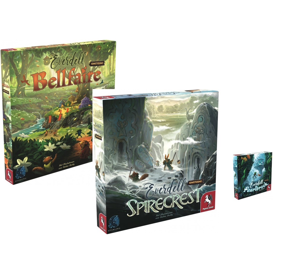 Ebenfalls seit Kurzem erhältlich ist die zweite Auflage der ersten Everdell-Erweiterung, Pearlbrook. In Pearlbrook entdecken die Spielenden eine Unterwasserwelt. Dazu entsenden sie Botschafterfrösche zum Pearlbrook-Fluss, um Perlen zu sammeln, mit denen sie in ihrer Stadt sagenhafte Wunder und Schmuckstücke erschaffen können. Tief unter der schillernden Oberfläche des Flusses treffen sie außerdem auf bislang unbekannte Wasserwesen und atemberaubende neue Gebäude.