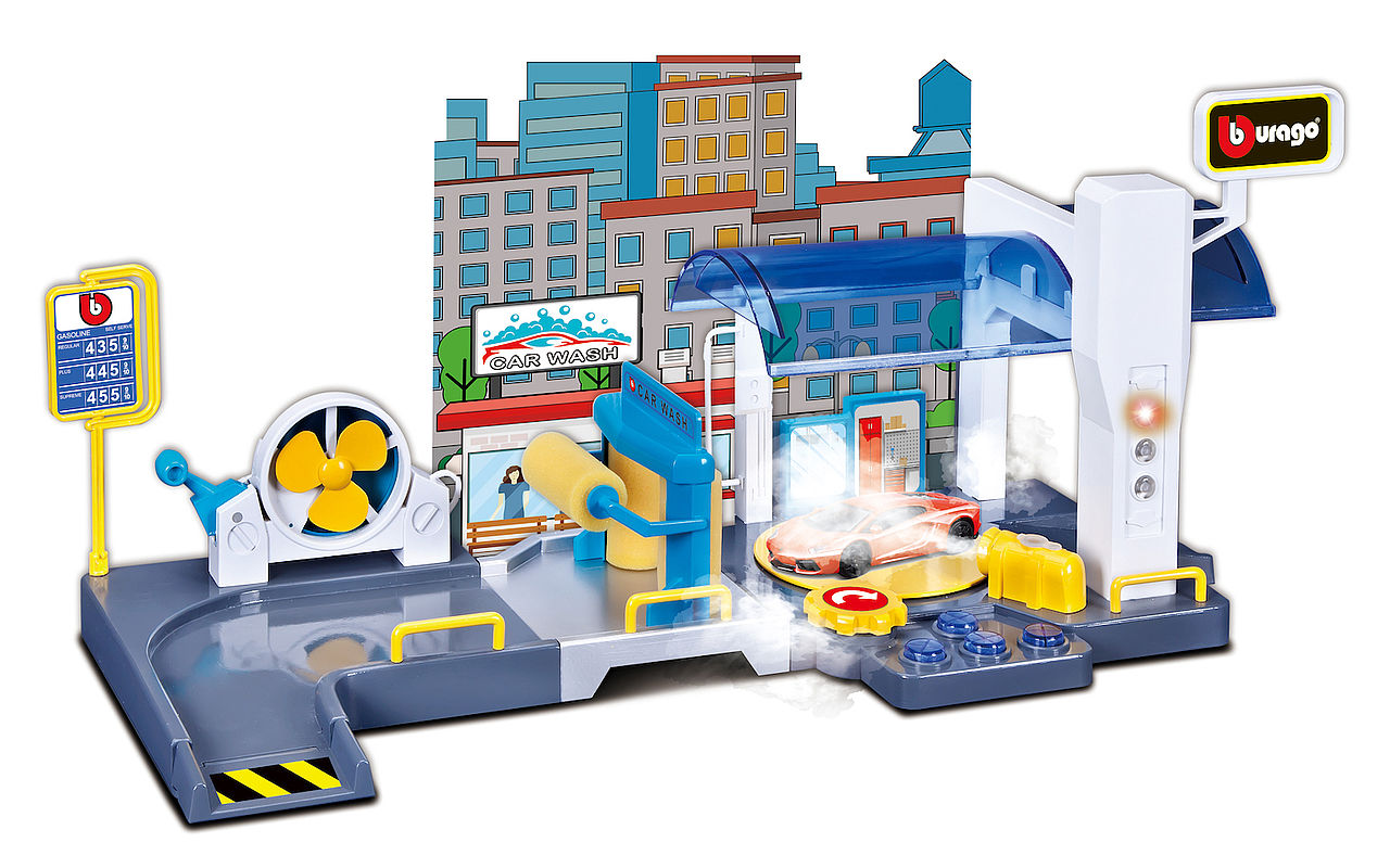 Realistischer Spielspaß mit dem neuen Playset Car Wash: Alle Bburago-Autos werden hier top gepflegt und wieder auf Vordermann gebracht. Als besonderes Extra bietet das Playset eine Wasserdampffunktion für „echt saubere“ Spielerlebnisse.