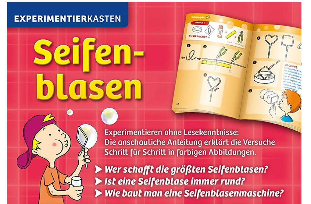 Geeignet ist der Experimentierkasten mit den Seifenblasen für Kinder ab 5 Jahren. Die Anleitungen sind kindgerecht geschrieben und mit Hilfe von kleinen Bildern verdeutlicht. So haben die Kinder die Möglichkeit, sich selbst auszuprobieren, ohne dass sie schon lesen können.