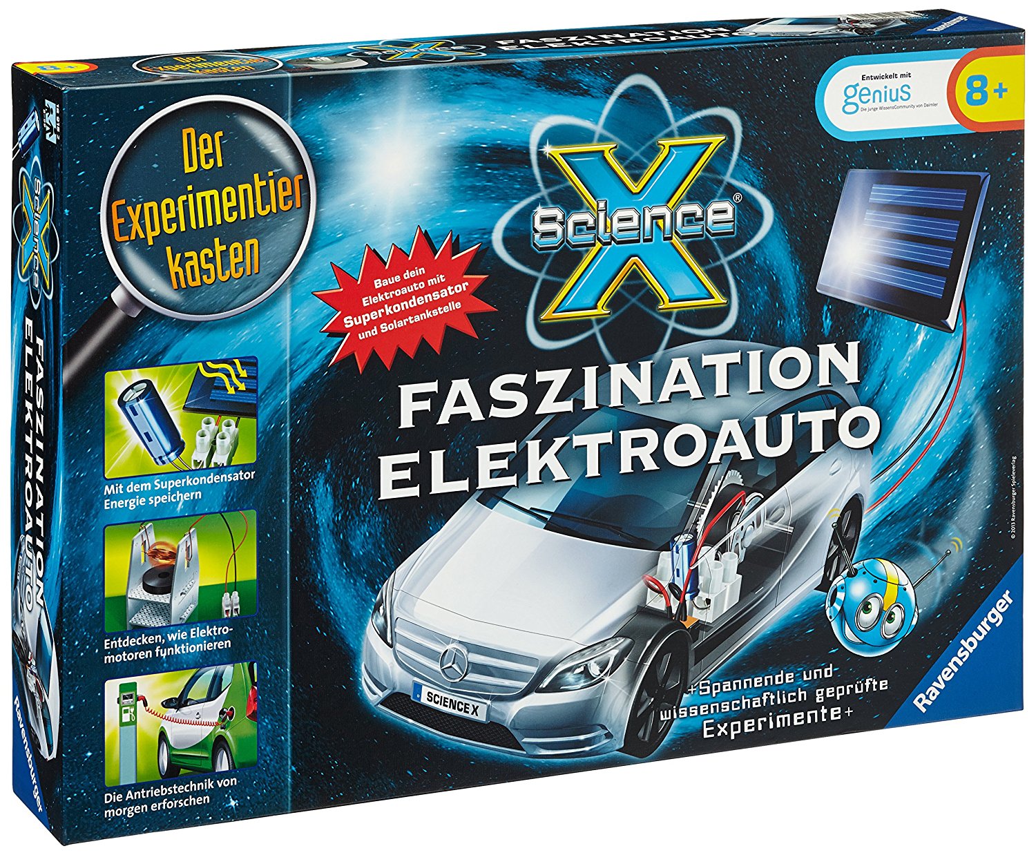 Baue dein eigenes Elektroauto mit Solartankstelle und Superkondensator. Erforsche in acht spannenden Experimenten die Antriebsenergie der Zukunft! Los geht’s – entdecke die Welt der Elektroautos mit Experimenten!“, so bewirbt die Ravensburger Spieleschmiede den neuen Experimentierkasten.