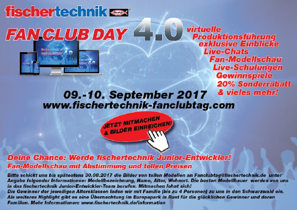 Zentrale Anlaufstelle ist das zweisprachige Webportal www.fischertechnik-fanclubtag.com. Es wird für die Dauer des Fan Club Tags am 9. und 10. September freigeschaltet sein. Fotos für die Modell-Galerie können bis zum 30. August an die E-Mail-Adresse fanclubtag@fischertechnik.de gesendet werden. Im kommenden Jahr ist dann wieder ein traditionelles Fan-Treffen vor Ort in Waldachtal geplant.