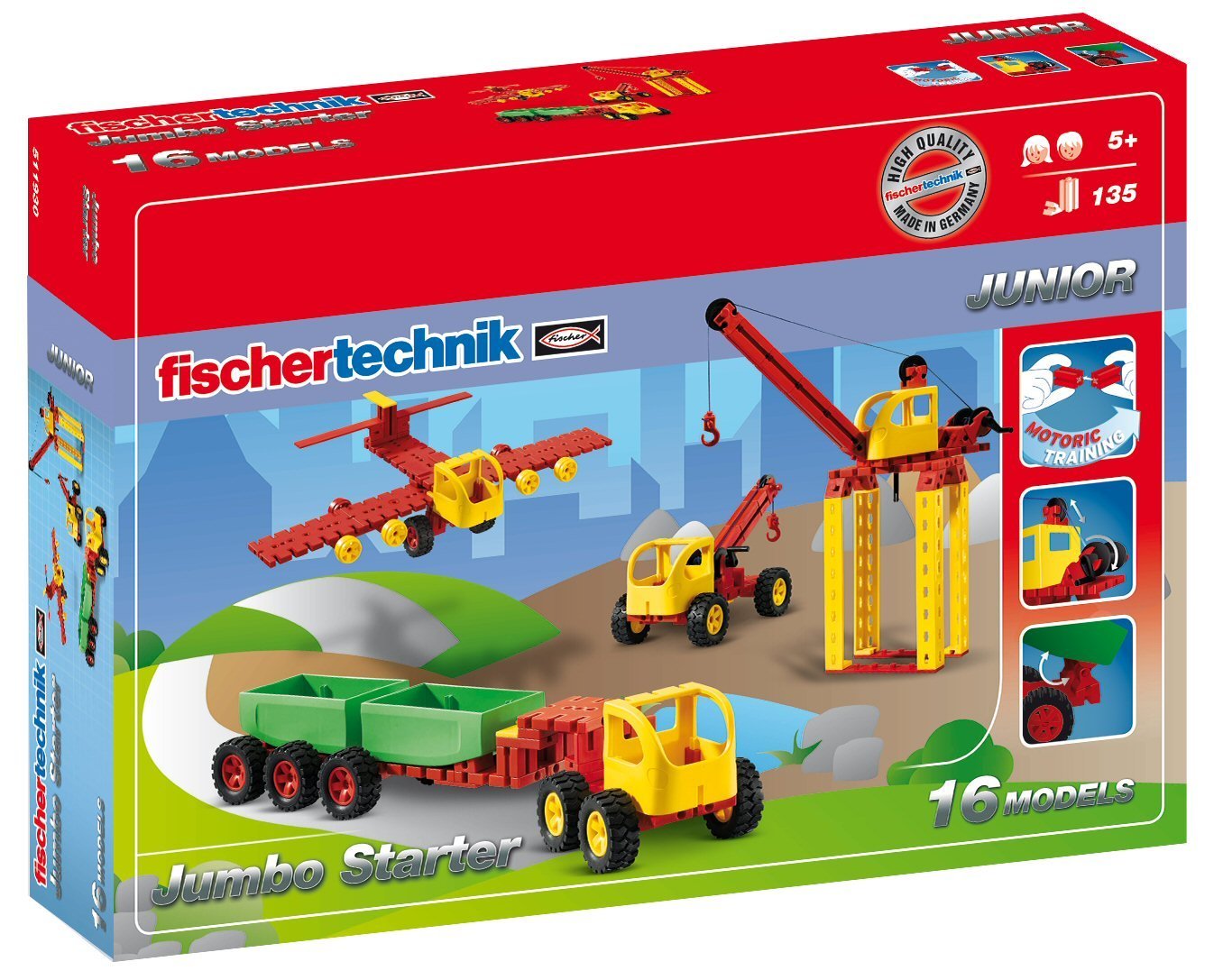 Das Junior Starter Paket bietet gleich 16 Modelle in einem Modellbaukasten und dies reicht vom Tieflader bis zum Traktor.