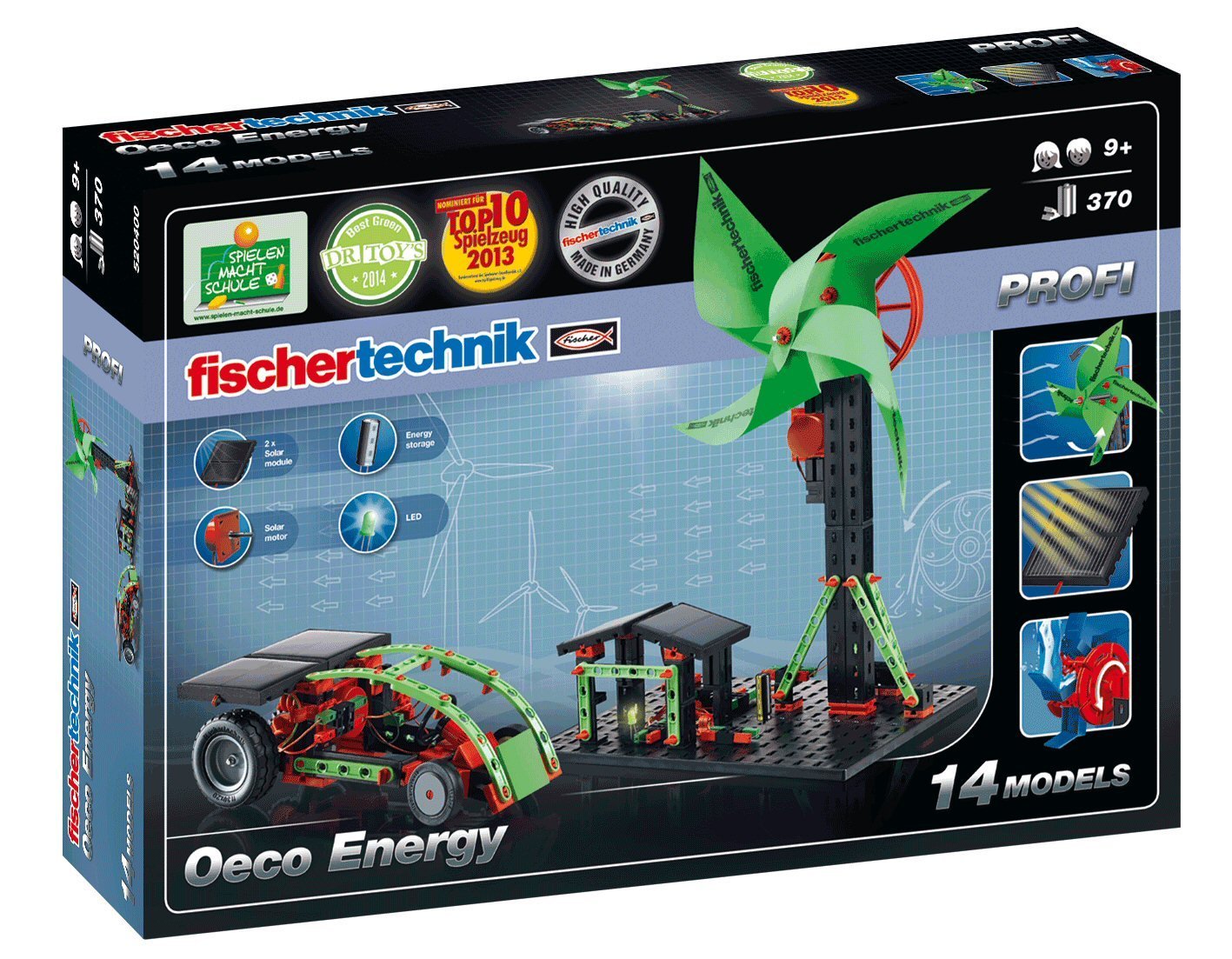 Fischertechnik PROFI Oeco Energy – befasst sich mit umweltfreundlicher Stromerzeugung, „Erneuerbare Energien“, der Gewinnung, Speicherung und Nutzung von Strom aus den natürlichen Energieträgern Wasser, Wind und Sonne.