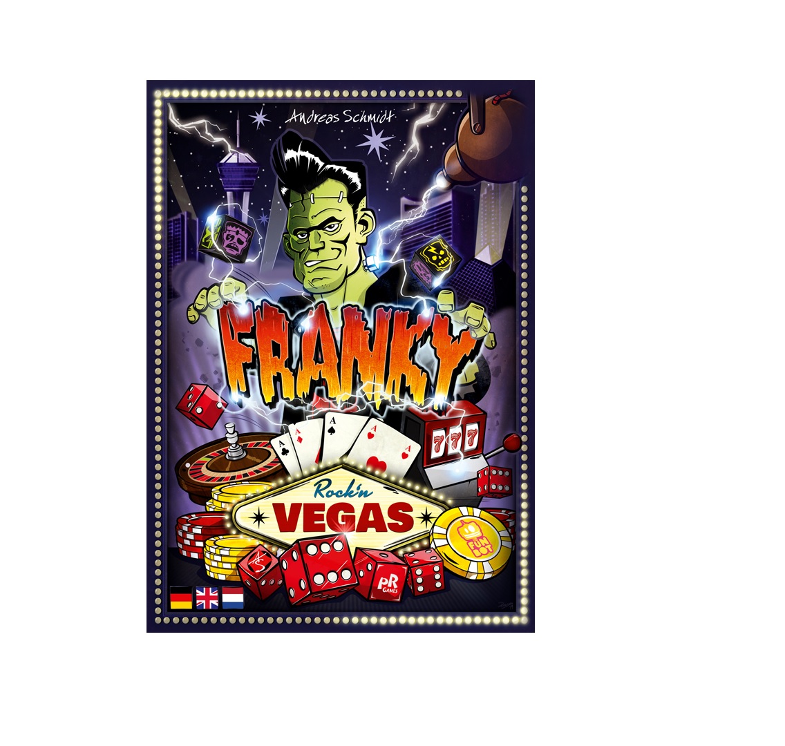 Franky RocknVegas von Andreas Schmidt ist eine Eigenentwicklung des kleinen Verlags Funbot und soll mithilfe der Spieleschmiede als deutsche Erstauflage erscheinen. Funbot hat sich auf schnelle spaßige Spiele spezialisiert, die für Stimmung am Spieltisch sorgen. Franky soll da keine Ausnahme sein!