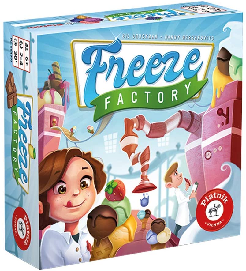 Manchmal hat man auch Glück und einer der Mitspieler verschiebt die Plättchen genau so, dass der eigene Eistüten-Auftrag erfüllt ist. Wer das konzentriert verfolgt und rechtzeitig „FREEZE“ ruft, hat seine Eistüte erledigt. Wer am Spielende die meisten Eistüten offen vor sich liegen hat, ist der neue Freeze Factory-Champion. Das flotte Verschiebespiel von Piatnik ist empfohlen für 2-4 Spieler ab 6 Jahren und dauert ca. 30 Minuten.