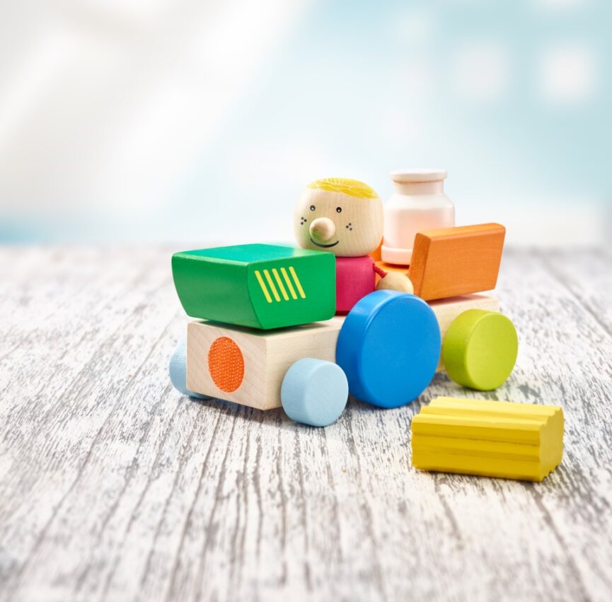 Gemeinsam mit der freundlichen Farmerin werden bei dem Stapelspielzeug Milchkanne und Stroh auf dem Heuwagen transportiert, der sich kinderleicht in seine sechs Einzelteile zerlegen und genauso schnell wieder zusammensetzen lässt.