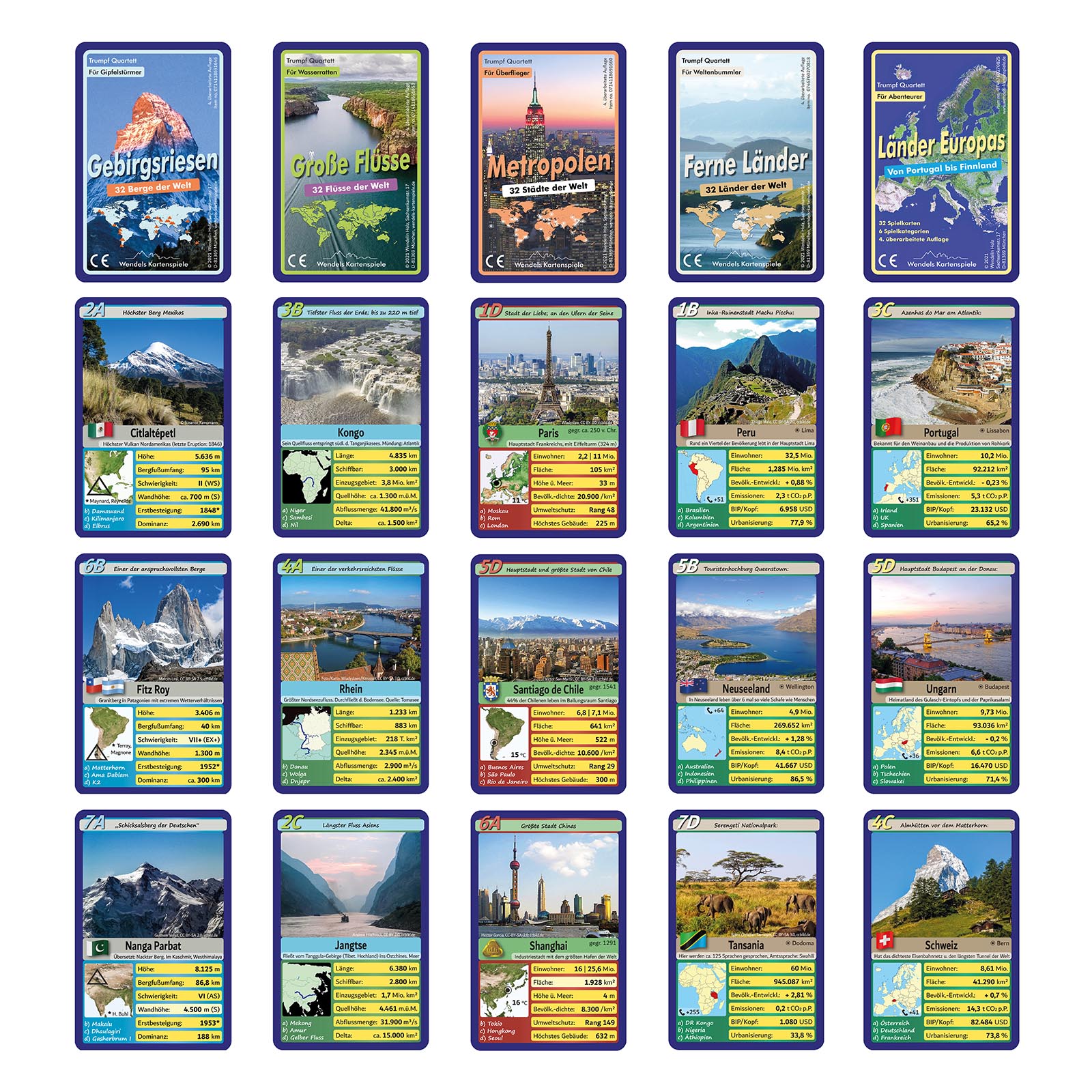 Fünf verschiedene Themen haben Wendels Kartenspiele bereits veröffentlicht, die nächsten vier sollen bald folgen: Berge Europas, Städte Europas, Seen der Welt und Wüsten der Erde. Bei Letzterem handelt es sich um eine Sonderedition, die in Zusammenarbeit mit dem Geografen, Fotografen und Wüstenexperten Michael Martin entstanden ist, der für das Projekt seine Aufnahmen zur Verfügung gestellt hat.