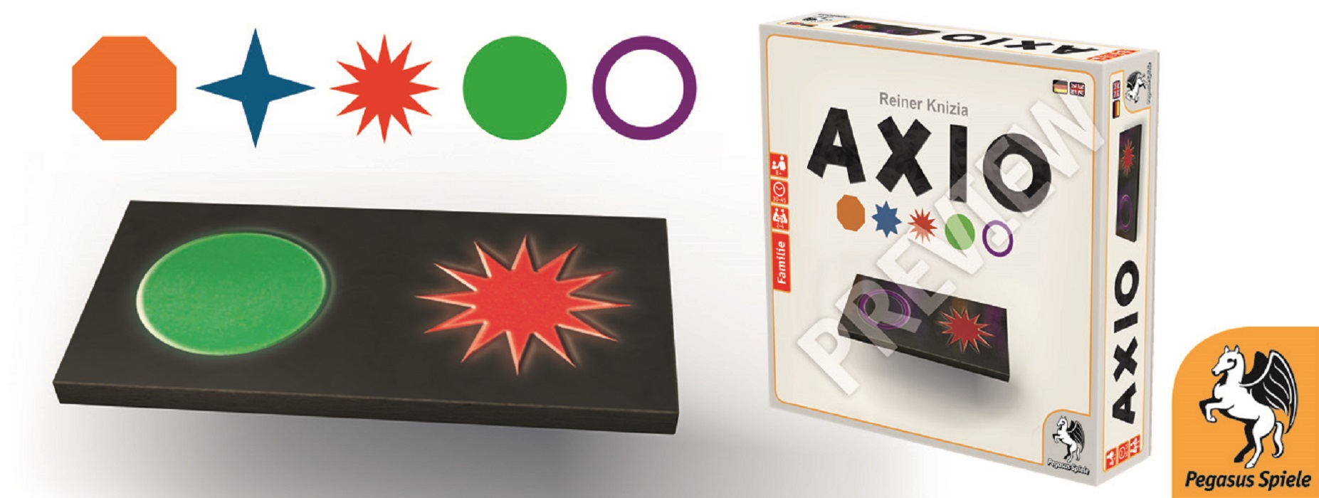 Pegasus Spiele stellt auf der Spielwarenmesse in Nürnberg AXIO vor, das Hauptspiel einer neuen Spielereihe des mehrfach ausgezeichneten Spieleautoren Dr. Reiner Knizia. AXIO ist eine Neuentwicklung in der Erfolgsreihe Einfach Genial und belebt das bekannte abstrakte Spielprinzip.