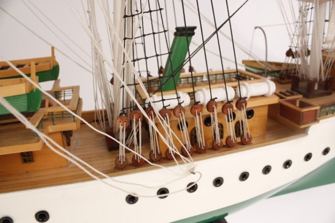 In der Takelage, auf den Decks und an den Aufbauten entdeckt der aufmerksame Beobachter stets neue Details – egal ob es die 18 offenen und 3 gerefften Einzelsegel der Vollbetakelung sind, das Ruderblatt, die vier Beiboote oder zahlreiche Bauteile aus echtem Metall.